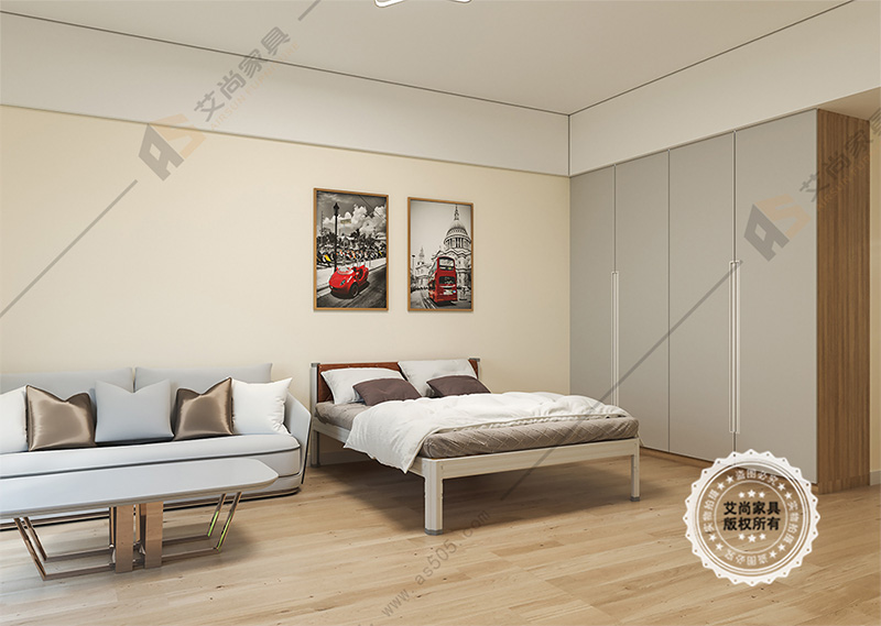 板式床:基本材料采用人造板,使用五金件连接而成的家具,方便拆装、运输、安装,一般款式比较简洁,不变形、不开裂、价格适中,在市场中的数量较多。但由于常用五金件连接,板式床最容易出现连接不牢固,从而产生床体松动,发出响声,在环保上还是有所欠缺,比如有些厂商以刨花板等材料生产,而贴面又没有将其全包上的话,易释放对人体有害的甲醛,不过正规,特别是品牌的板式家具,都是经过严格加工和检查了的。