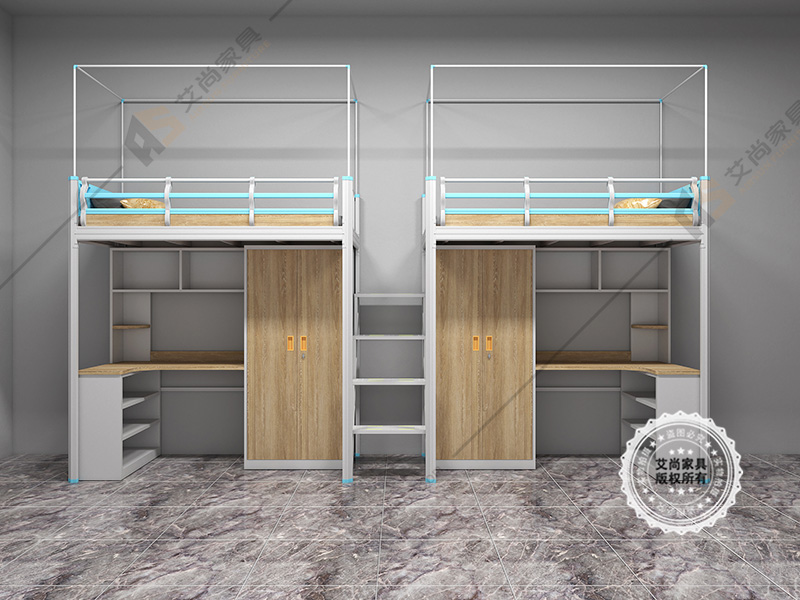 艾尚家具多年专业生产定制销售宿舍公寓床,选用材质为优质冷轧钢,中空异形材,永久不生锈,个性美观。每张床可以承重500kg,全围护栏235mm高,楼梯带有防滑条,安全性能高。全床无螺丝,卡式连接更新颖,符合现代化审美。
