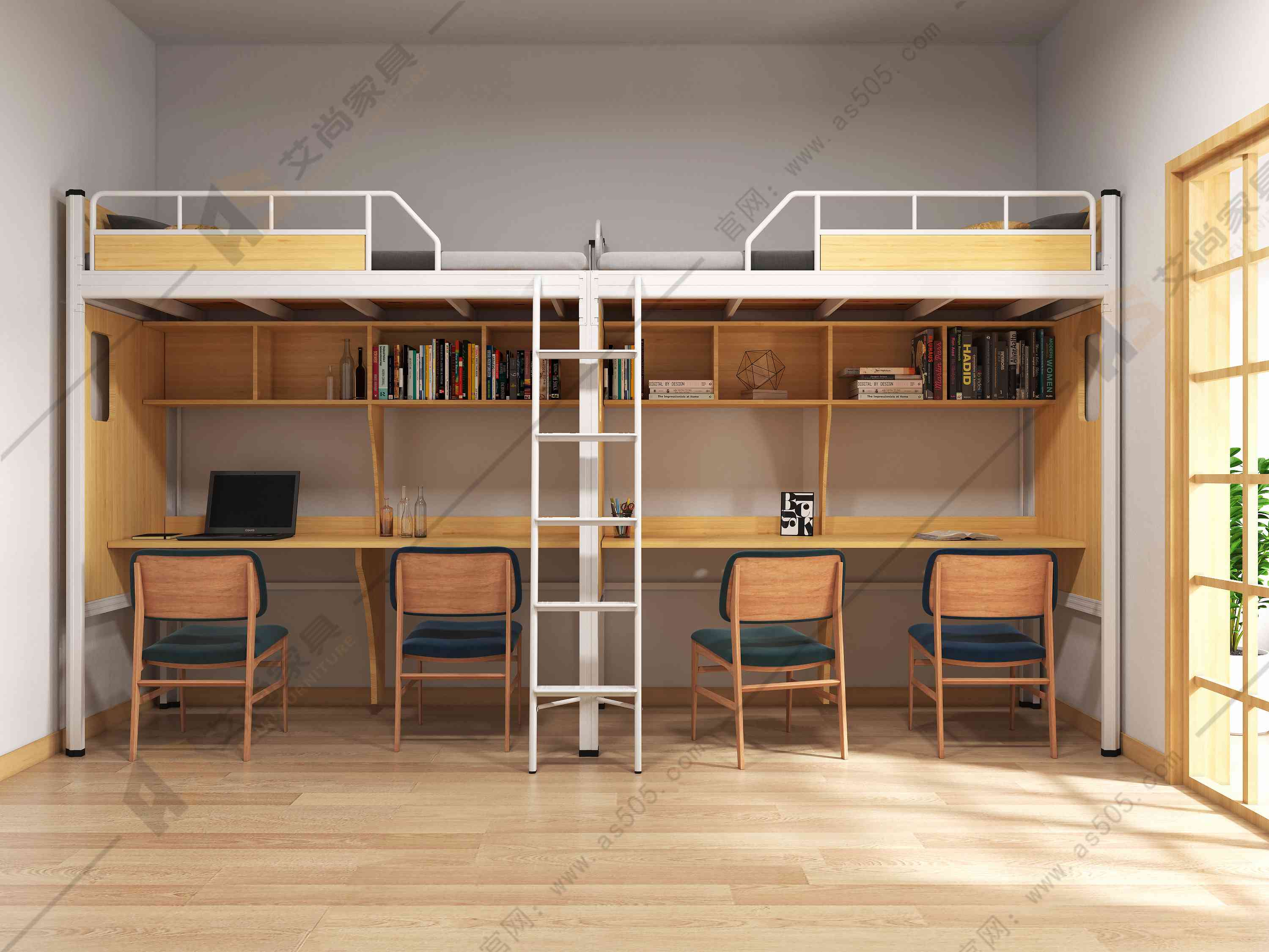 双层床,床的侧面有扶梯,上铺有护栏,尺寸可以定制,特点是减少占地面积,节省空间。