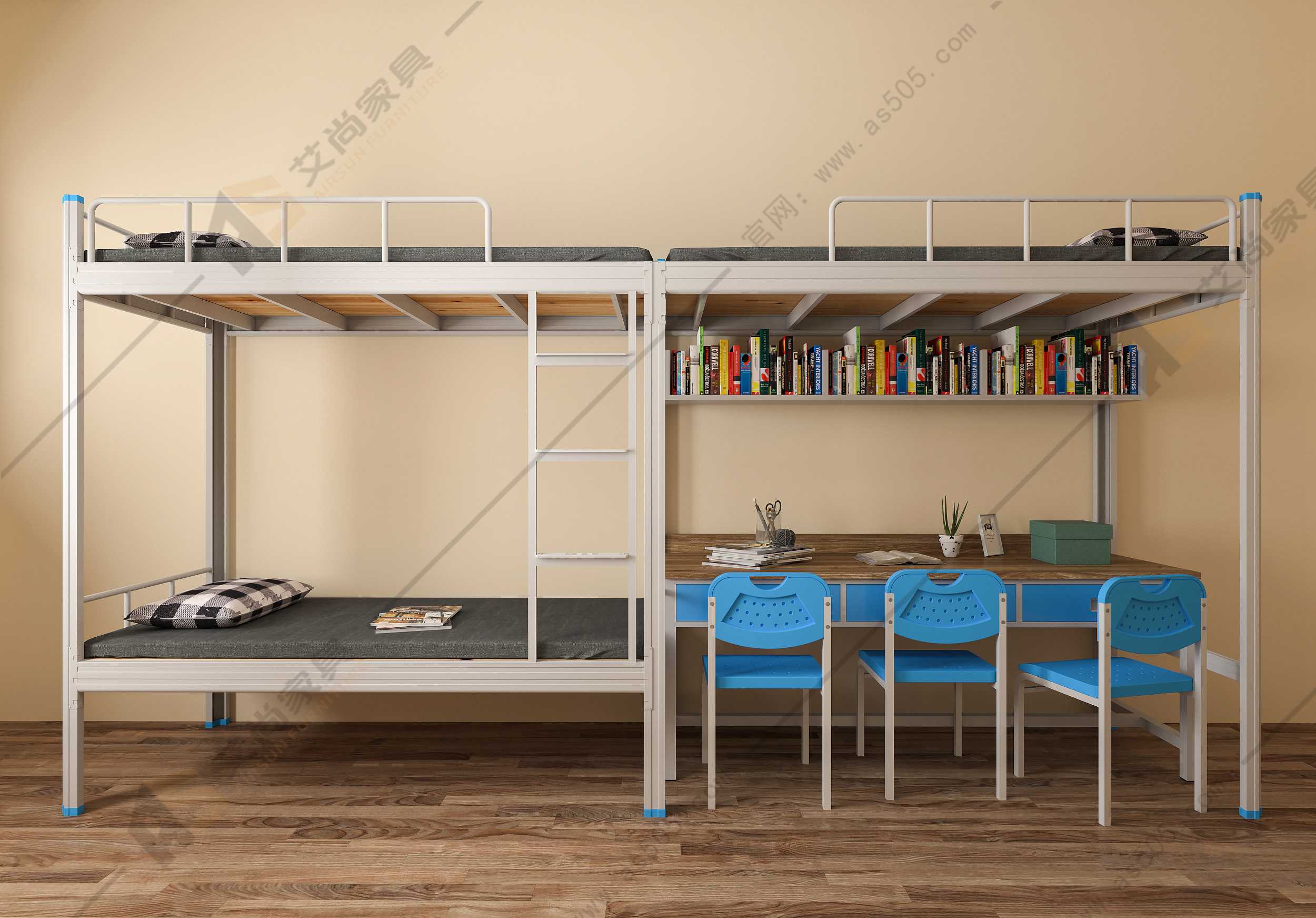艾尚开口型材的学生宿舍床,从内到外进行静电喷涂,防锈除锈工艺做到十足!卡扣式衔接更让床体更加稳固耐用。使用寿命长达十年,而且有完善的售后服务机制。