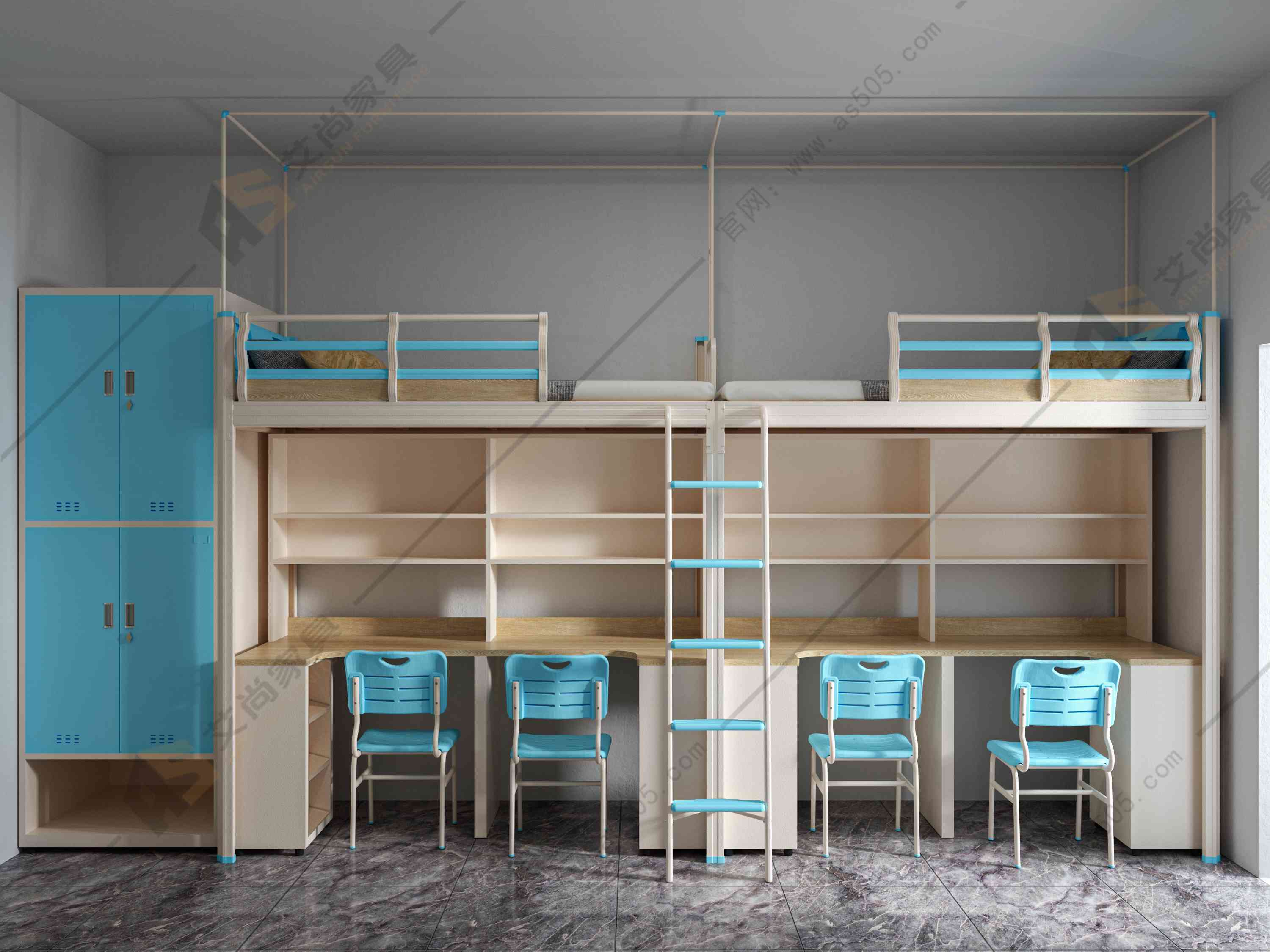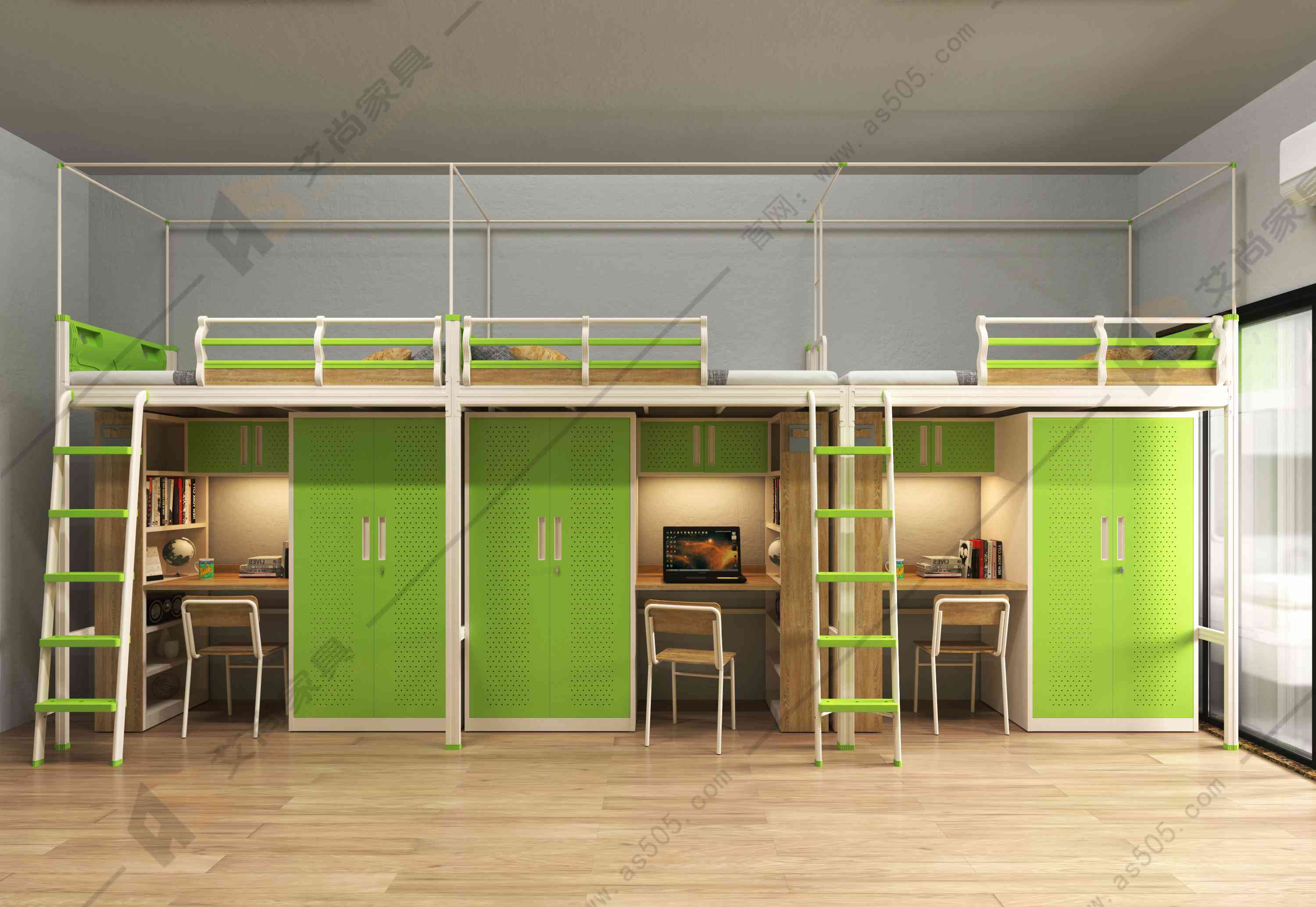 现在很流行的上面是床,下面是桌子的宿舍床,我们一般把这种款式叫做“公寓床”。公寓床包含,床架,床板,公寓柜,书桌,以及楼梯。楼梯常见的两种款式为:中梯(又名走梯,可以直接走上去的那种),侧梯(又名爬梯,就是要爬上去的那种)。