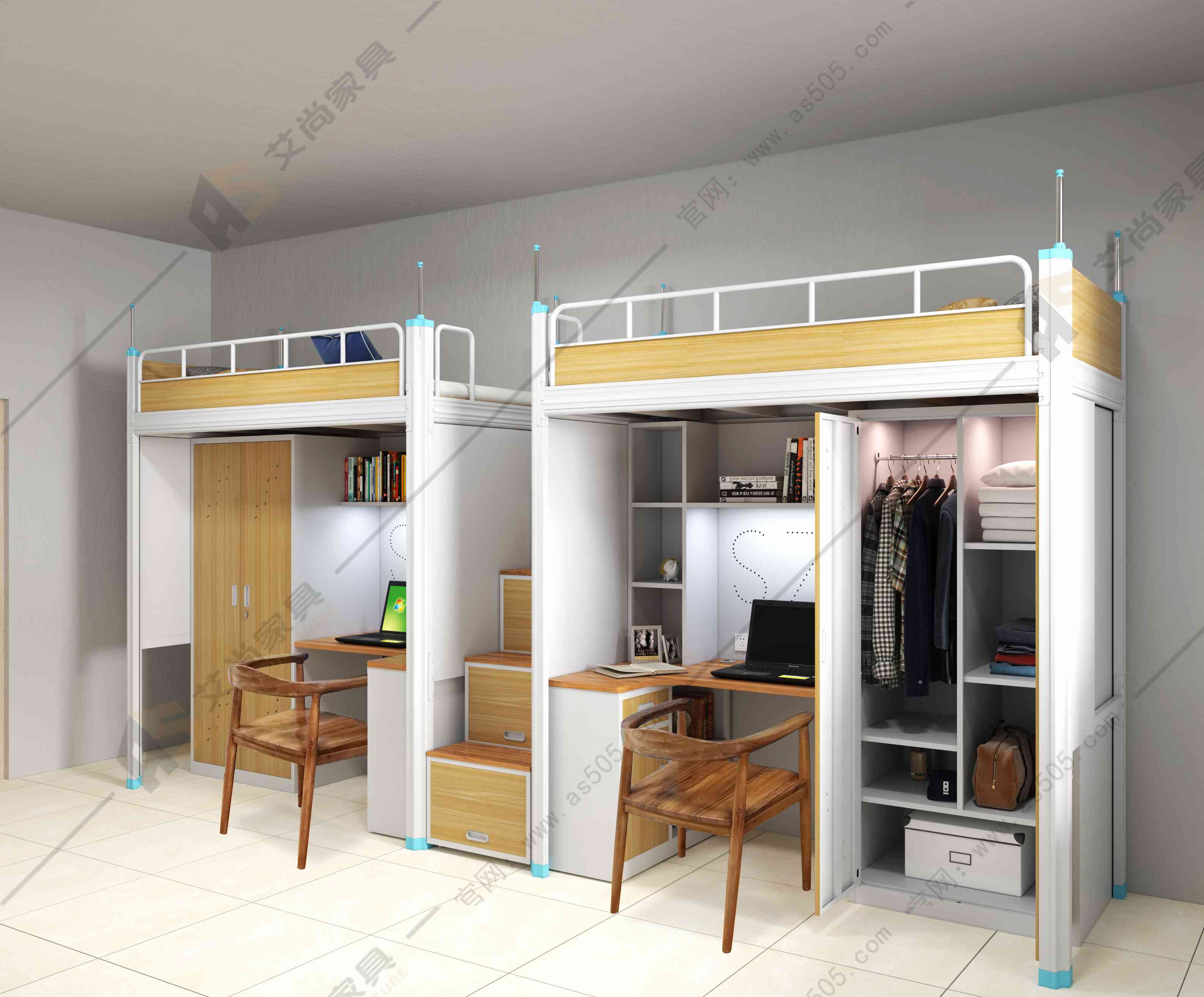 艾尚宿舍公寓床中梯可设计为楼梯柜,每一层楼梯都可设计一个储物格,方便收纳分类。衣柜内部可按客户需求分为叠衣区、挂衣区,还可在内部增加抽屉放置贴身衣物,设计开放格放置包包等,充分满足您的收纳需求。