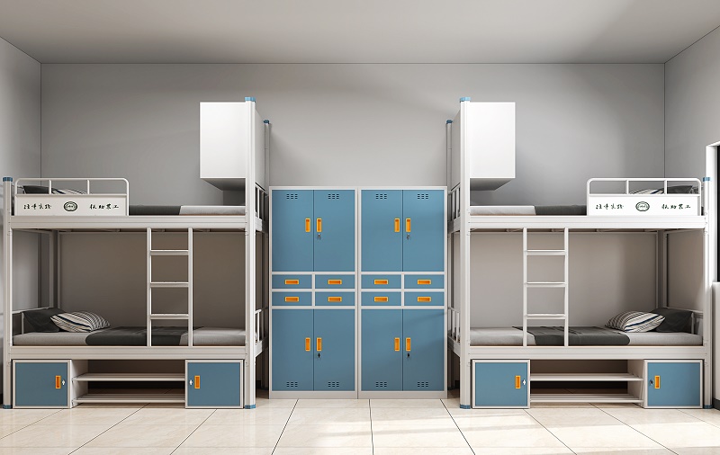 相对于传统的宿舍双层铁架床,现在的宿舍双层铁架床可定制储存空间给学生放置生活物品,艾尚可按客户需求配备衣柜、储物柜、鞋柜等,还可配备书桌供学生学习,可谓是学习生活两不误。