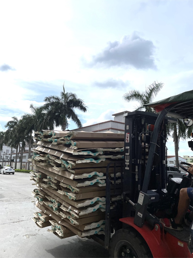 装有宿舍床的纸箱已被整齐有序地摆放在车上,在蓝天的衬托下,显得格外整齐养眼!准备出发前往各个合作院校。装车完毕,工作人员例行清点数量,确保数量准确无误之后开始启程!