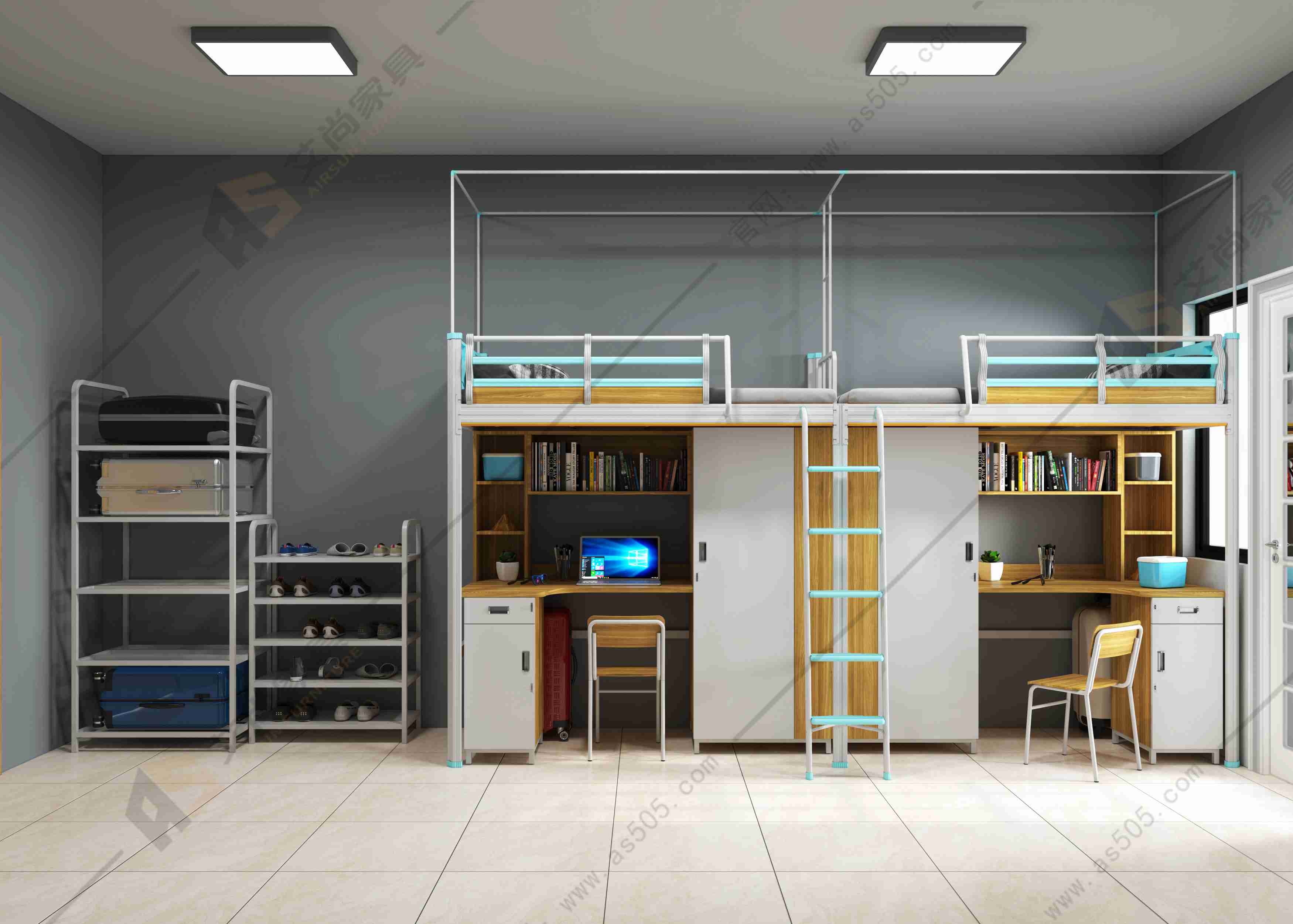 学生公寓床是宿舍床的多种类型之一。广泛应用于学校、企事业单位等集体宿舍。学生公寓床通常采用床与柜的组合,一般包括床、书柜、衣柜、书桌等宿舍家具。书桌把书柜和衣柜连在一起。整体为立体空间组合,既节省空间,又整洁美观。梯子在书架的一边。梯子分为侧梯、中梯和内梯,梯子的选择可以根据实际空间距离及预算按需定制。