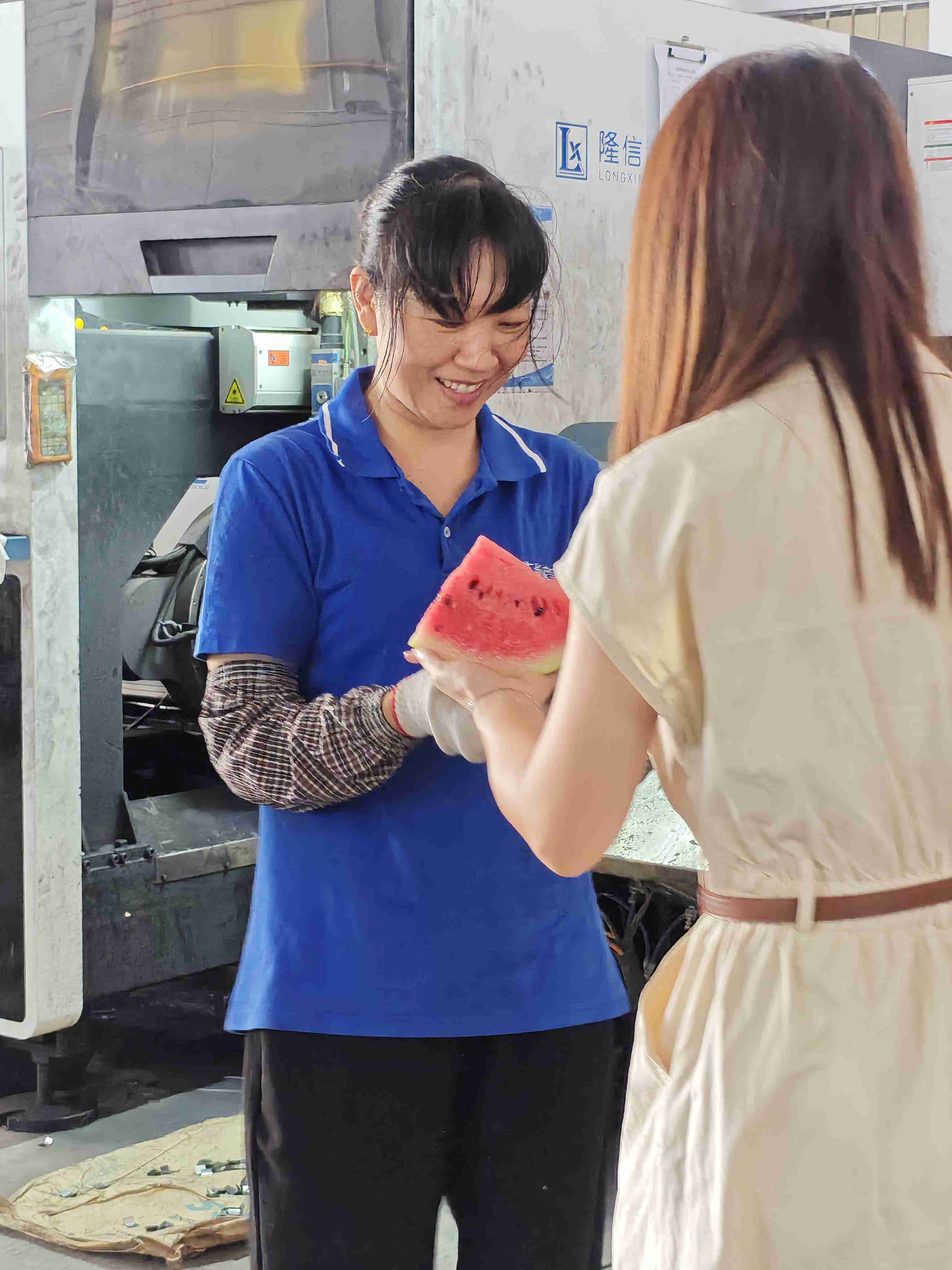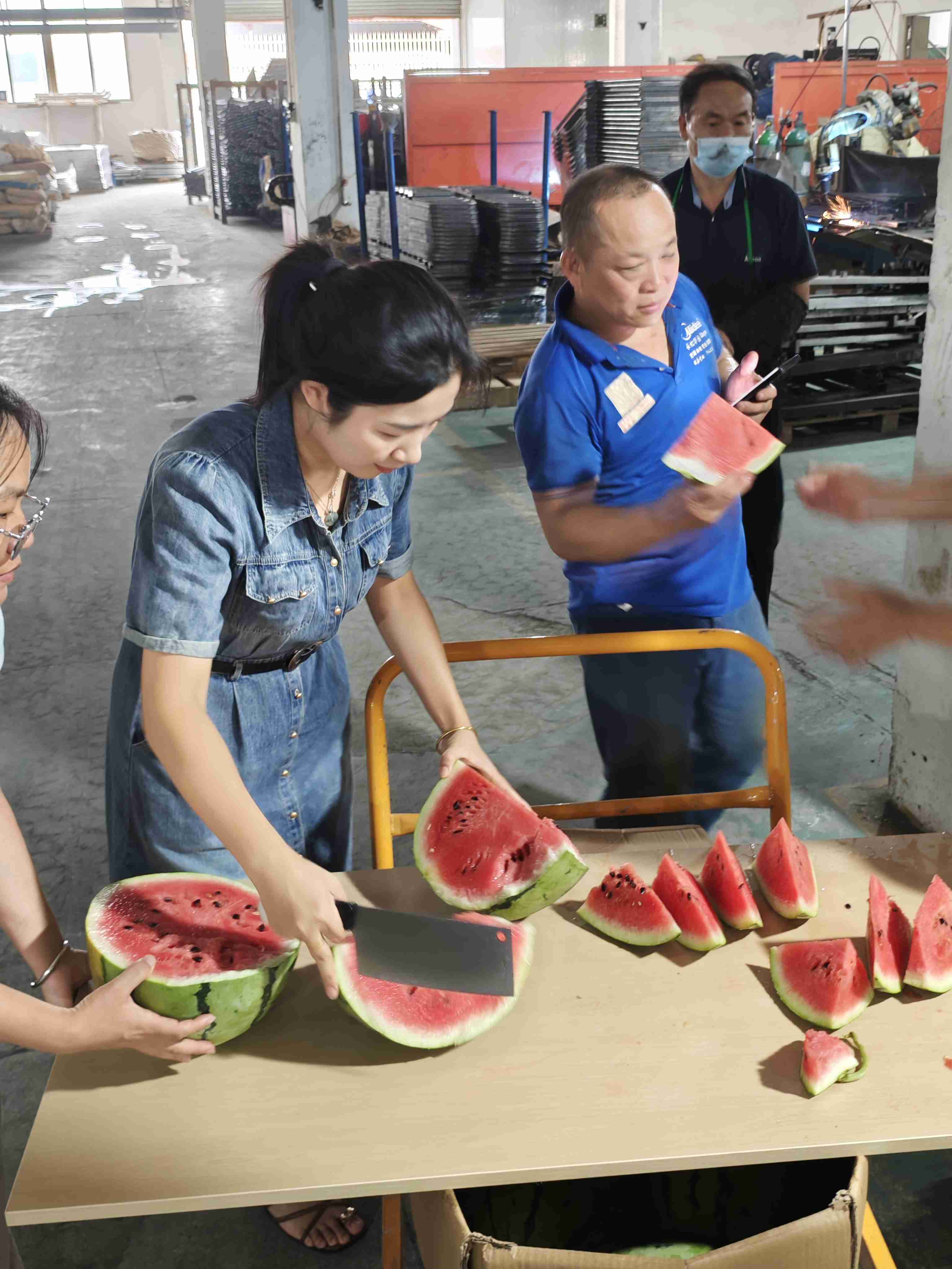 盛夏的广东烈日炎炎,广东艾尚家具有限公司车间内,工人们顶着高温忙碌,汗水见证着他们的坚守。为给大家解暑,公司特意准备了清甜的绿豆汤和冰镇西瓜。
