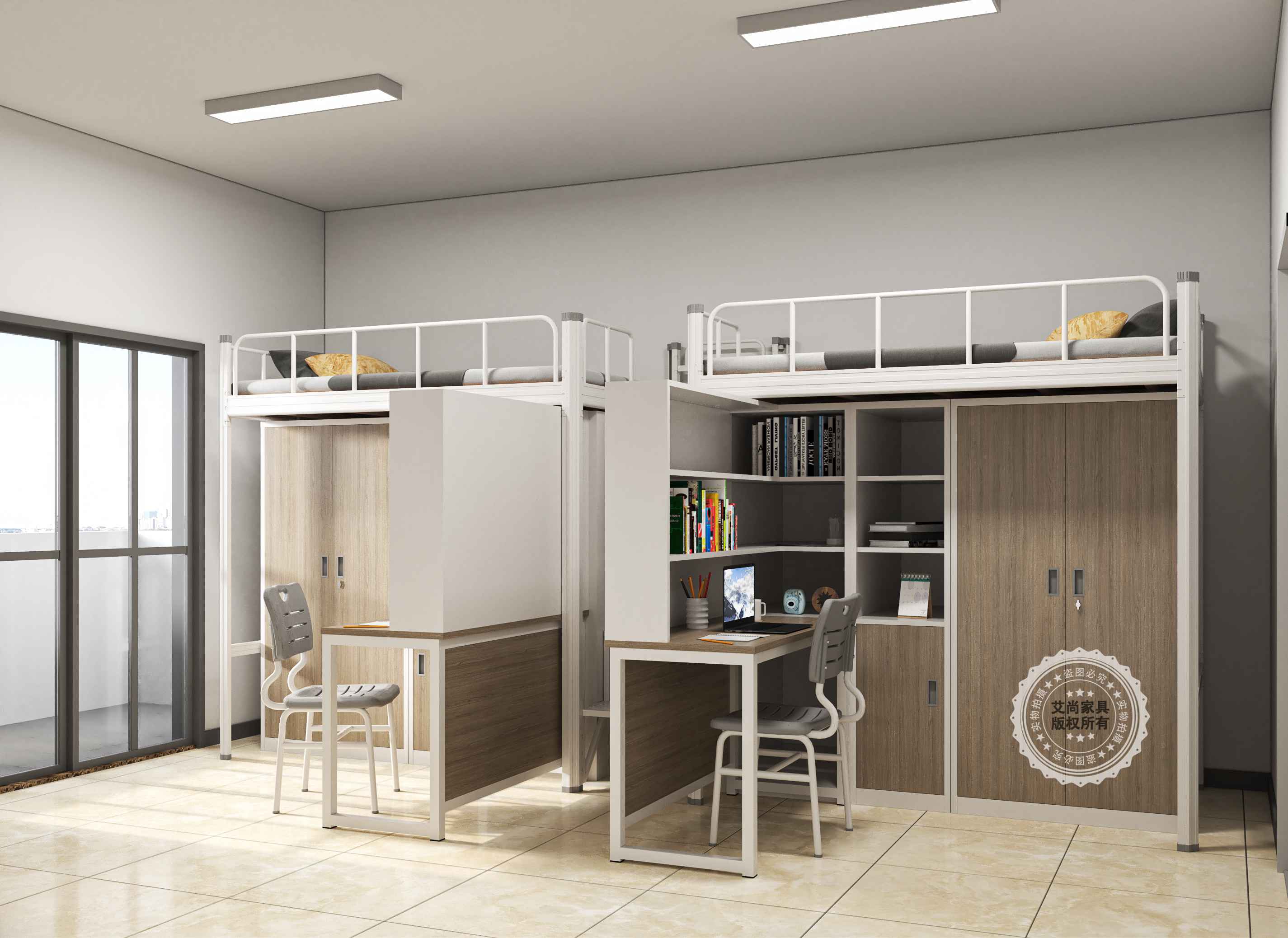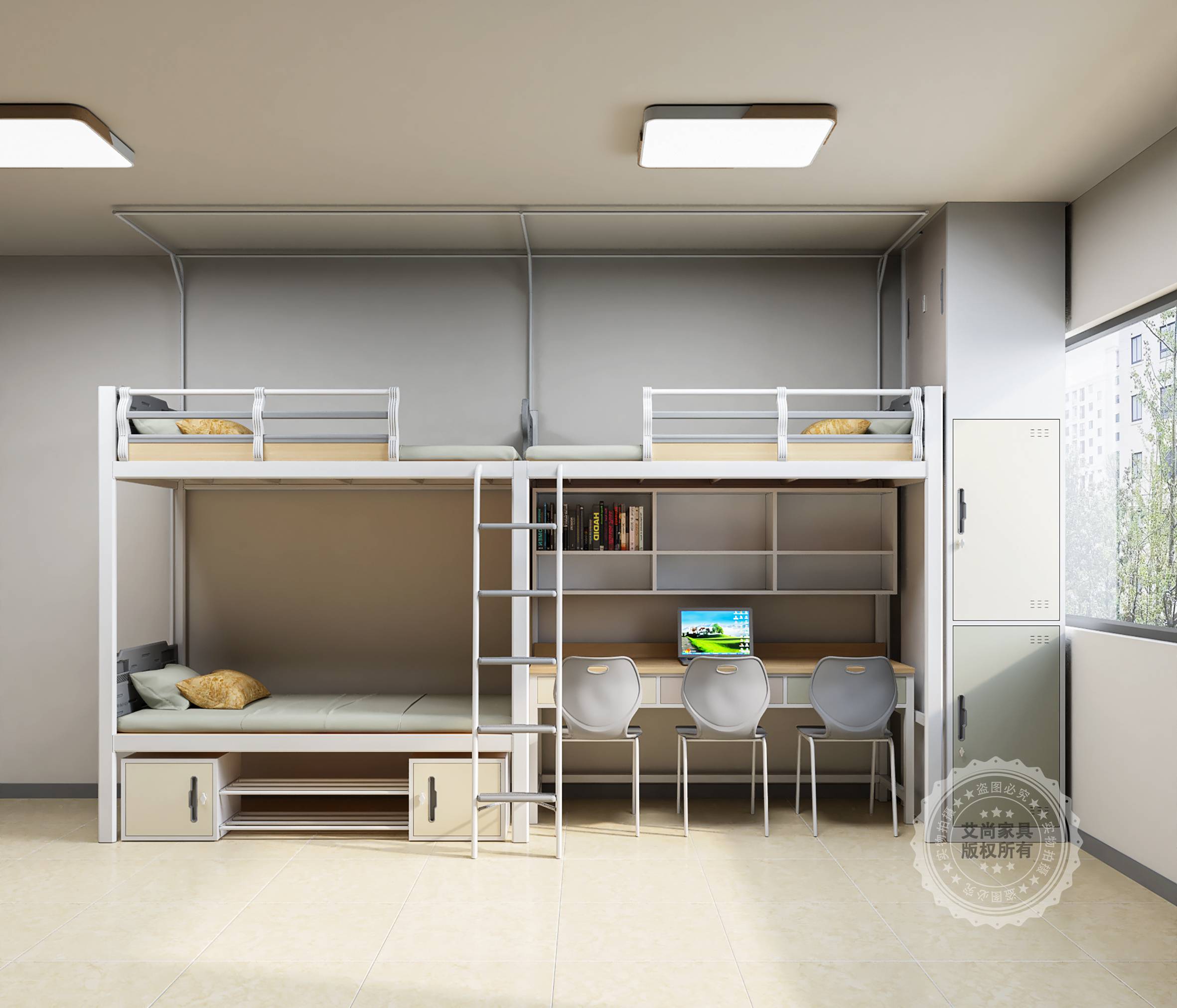 艾尚定制:可根据宿舍户型、企业文化,在尺寸、功能模块、颜色等方面进行个性化配置,实现空间利用最大化。