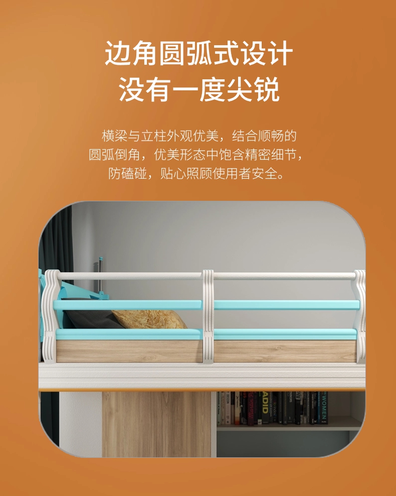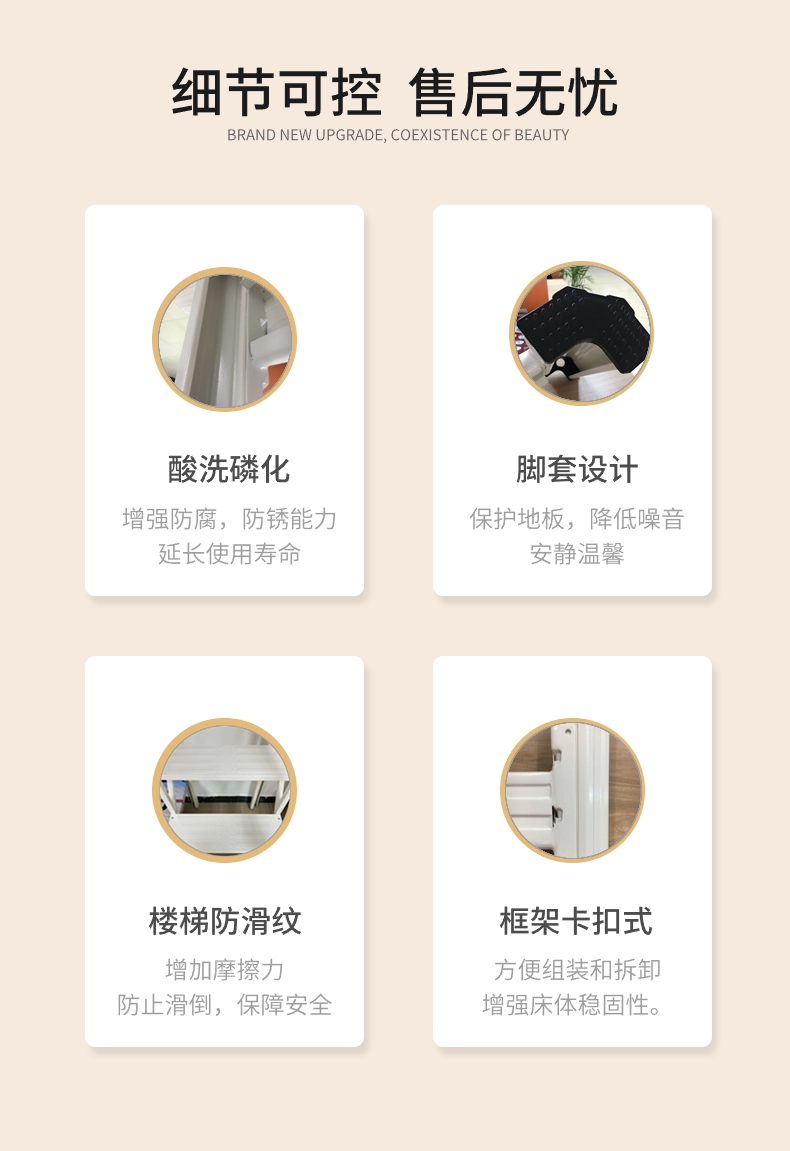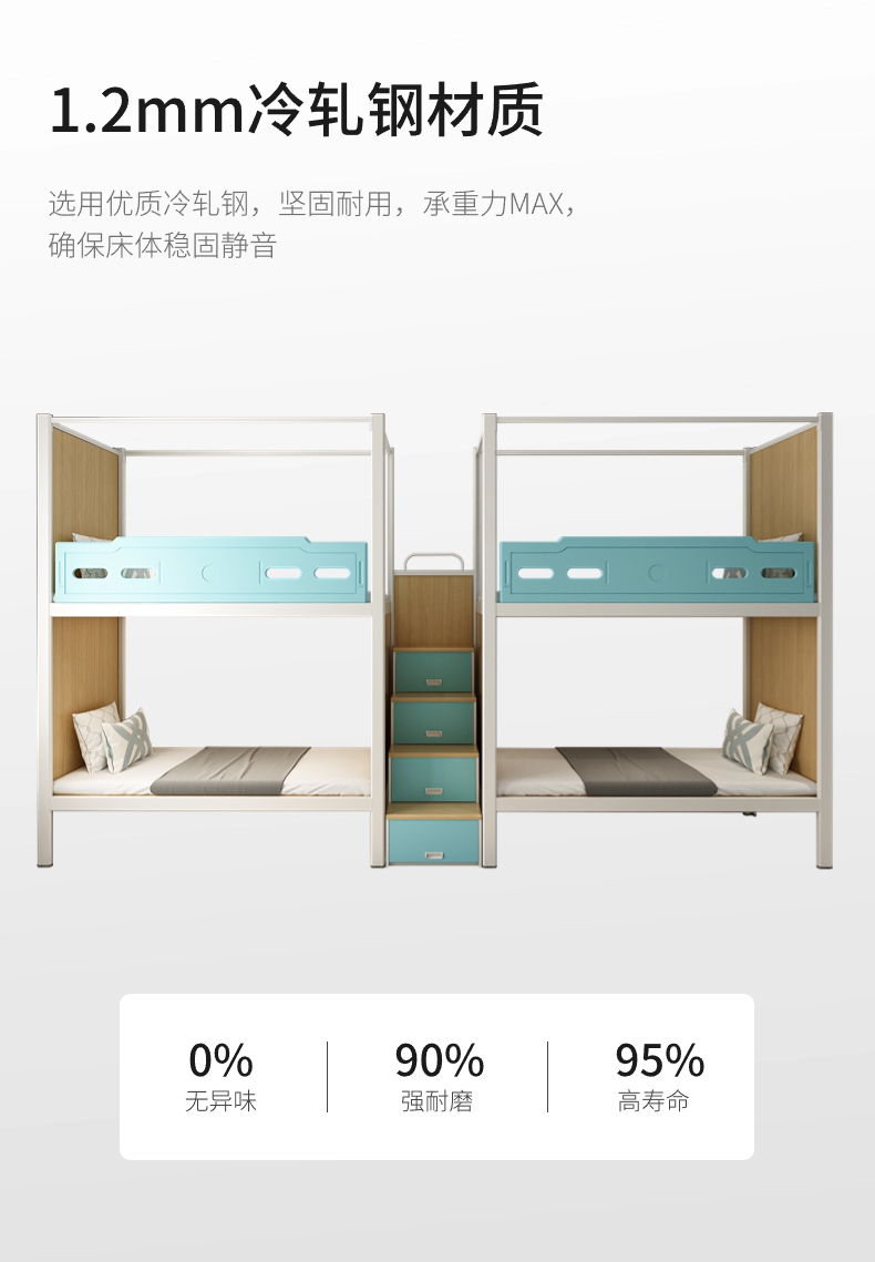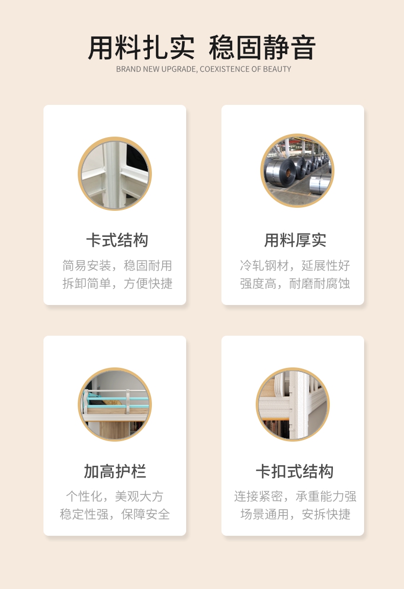 床架结构稳固不易变形,承重力好,床体承重力达500KG 根据人体工程学设计,上下舒适自如!