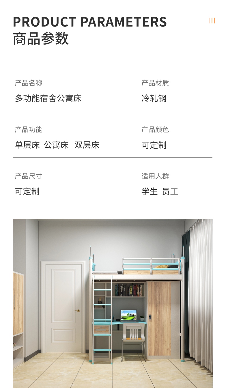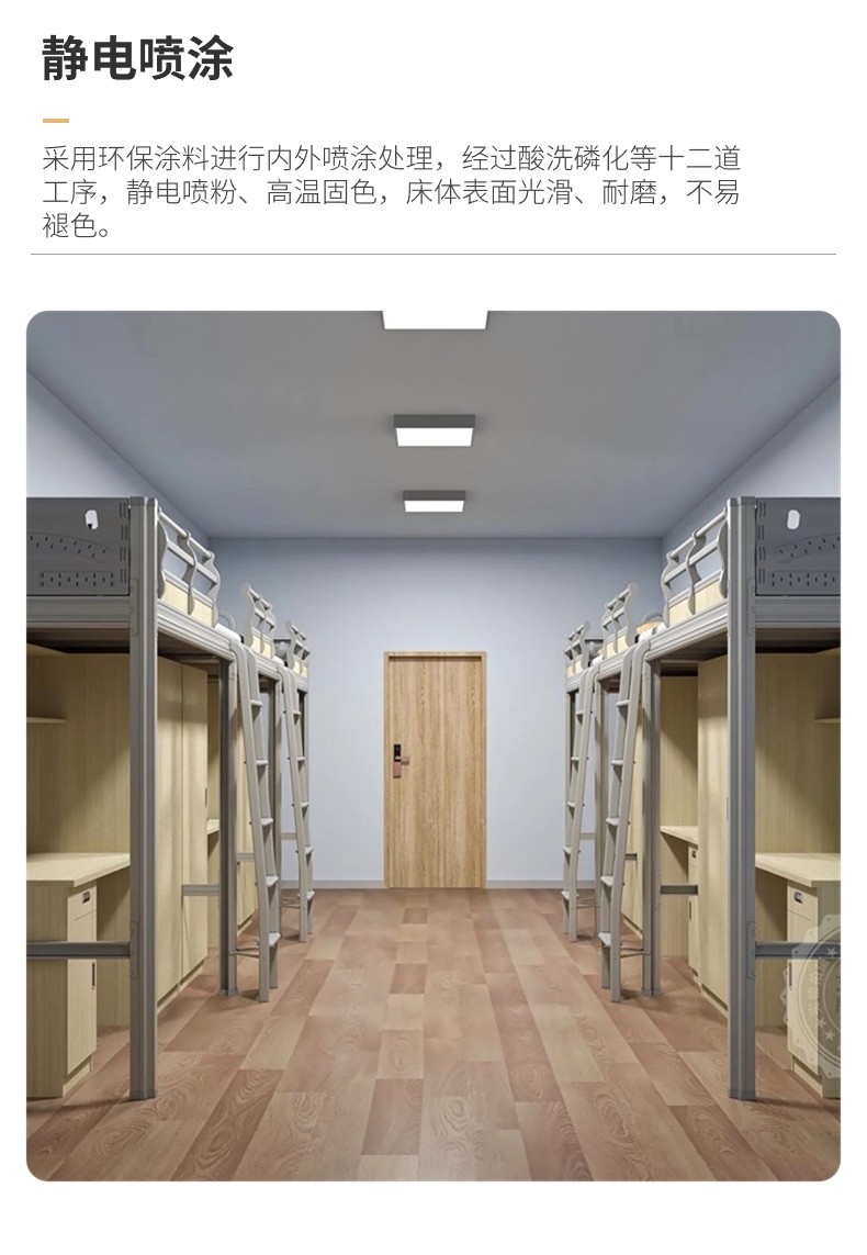 产品介绍: (尺寸可根据客户要求定制),本产品颜色使用白色(颜色可按照客户喜好定制),原材料使用1.2mm冷轧钢板,床体承重500-1000kg,产品采用纸箱包装防止运输途中磨损,产品适用范围企业、单位、学校8人间宿舍均可适用。 本产品厂家质保十年!