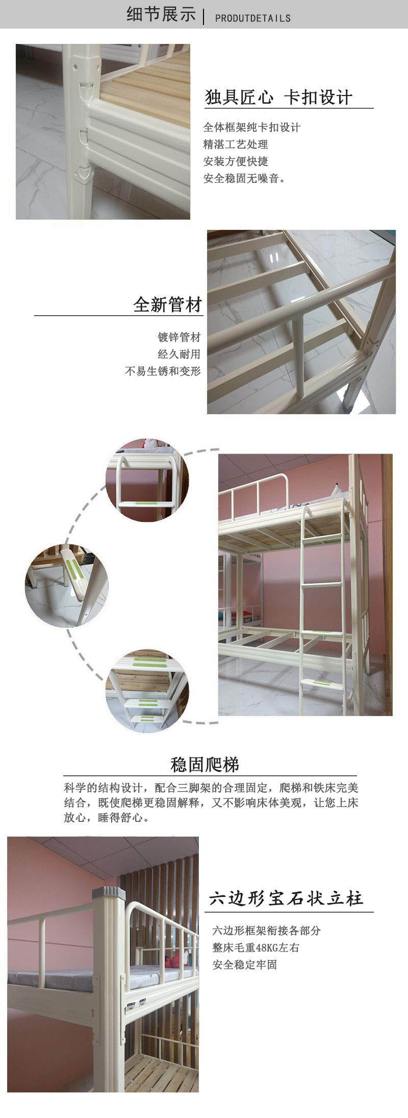 上下铺铁床表面全自动喷粉处理,0甲醛;中空异型结构,卡扣式连接、无螺丝;100%冷轧钢板不参假。真正的良心企业!