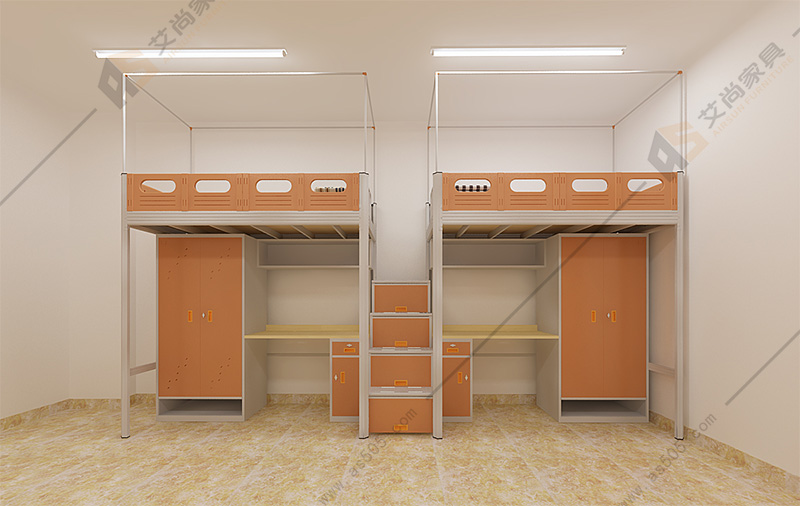 产品介绍: 两连体中梯双人位学校宿舍床,产品常规尺寸4480长900宽2100高mm(可按照客户宿舍需求定制尺寸),产品整体颜色:灰色床架搭配棕色柜子(可根据客户喜好定制颜色),床架:原材料采用优质冷轧钢板经特制成型线轧制而成,材料厚度为1.2mm(国标)床体承重500-1000kg!产品采用纸箱包装减少运输途中受损,产品主要适用于企业、工厂、学校4人间宿舍,本产品质保十年!