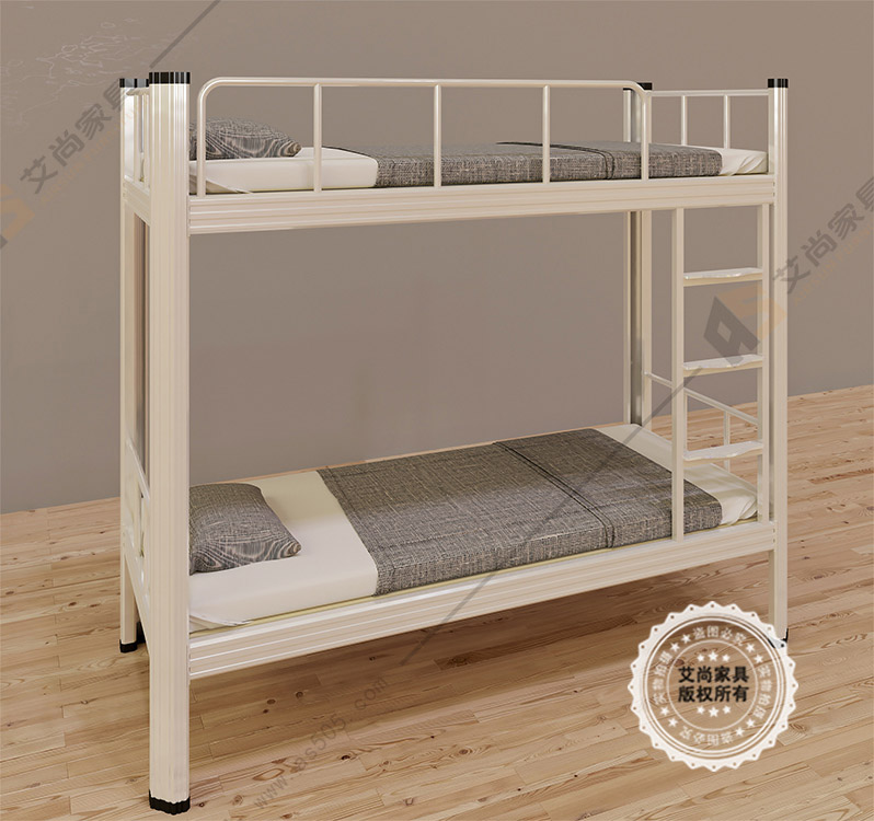 产品介绍: 单体侧梯双人位上下铺铁床(艾尚定制厂家),常规尺寸1980长*900宽*1800高mm(尺寸可根据客户要求定制),本产品颜色使用米白色(颜色可按照客户喜好定制),原材料使用1.2mm冷轧钢板,床体承重500-1000kg!产品采用纸箱包装防止运输途中磨损,产品适用范围企业、单位、学校4-8人间宿舍均可适用。 本产品厂家质保十年!